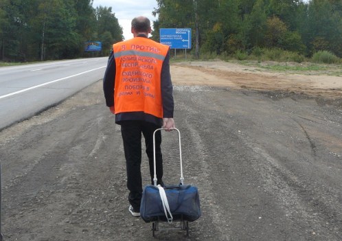 — Я выступаю против полицейского беспредела, судейского произвола и против поборов в школах и детских садах, — перед стартом своего протестного путешествия заявил вологжанин. — Конечный пункт — приемная Президента Российской Федерации. Пойду я пешком по обочине в соответствии с правилами дорожного движения. Я пойду через Грязовец по Старомосковскому шоссе, затем по М8 до Москвы.